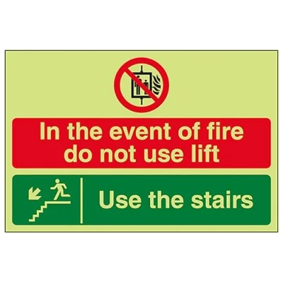 V Safety GITD In The Event Of Fire Do Not Use Lift/Use Stairs Down Left 200 x 150 mm Glow Dark Self Adhesive Vinyl Sign