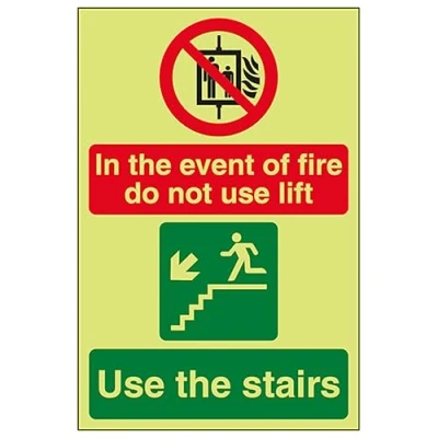 V Safety GITD In The Event Of Fire Do Not Use Lift/Use Stairs Left 150 x 200 mm Glow Dark 1mm Rigid Plastic Sign
