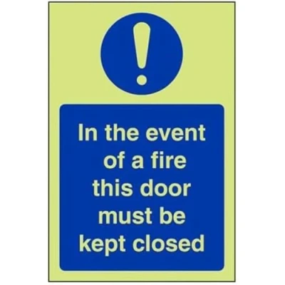 Helps to fulfil obligations to show vital escape route information about fire doors for all employees and visitors as per Health and Safety (Safety Signs & Signals) Regulations 1996 Conforms to EN ISO 7010:2012 Portrait Orientation. Sign reads "In The Event Of A Fire This Door Must Be Kept Closed" Highly durable Glow In The Dark Self Adhesive Vinyl and screen printed message will stand the test of time Sign measures 100 x 150mm. Self Adhesive material will adhere securely to most surfaces