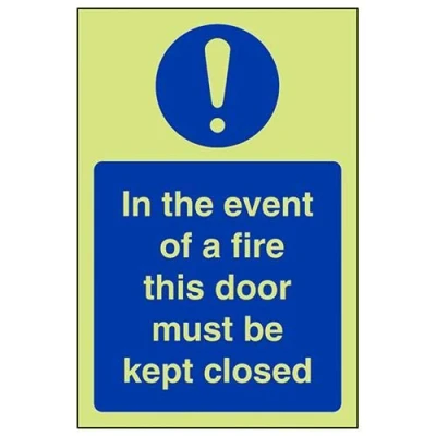 Helps to fulfil obligations to show vital escape route information about fire doors for all employees and visitors as per Health and Safety (Safety Signs & Signals) Regulations 1996 Conforms to EN ISO 7010:2012 Portrait Orientation. Sign reads "In The Event Of A Fire This Door Must Be Kept Closed" Highly durable Glow In The Dark Self Adhesive Vinyl and screen printed message will stand the test of time Sign measures 150 x 200mm. Self Adhesive material will adhere securely to most surfaces