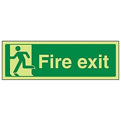 Helps to fulfil obligations to identify escape routes in a fire emergency for all members of staff and visitors as per Health and Safety (Safety Signs & Signals) Regulations 1996 Conforms to EN ISO 7010:2012 by featuring a green background with a white pictogram or text positioned centrally Landscape Orientation. Sign reads "Fire Exit" Highly durable Glow In The Dark 1mm plastic material and screen printed message will stand the test of time Sign measures 300 x 100mm