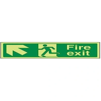 V Safety Glow In The Dark Fire Exit Arrow Up Left Sign 450mm x 150mm Self Adhesive Vinyl