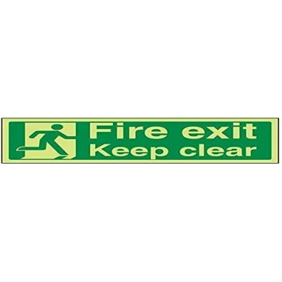 Helps to fulfil obligations to identify escape routes in a fire emergency for all members of staff and visitors as per Health and Safety (Safety Signs & Signals) Regulations 1996 Conforms to EN ISO 7010:2012 by featuring a green background with a white pictogram or text positioned centrally Landscape Orientation. Sign reads "Fire Exit Keep Clear" Highly durable Glow In The Dark Self Adhesive Vinyl and screen printed message will stand the test of time Sign measures 600 x 200mm. Self Adhesive material will adhere securely to most surfaces