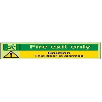 Helps to fulfil obligations to identify escape routes in a fire emergency for all members of staff and visitors as per Health and Safety (Safety Signs & Signals) Regulations 1996 Conforms to EN ISO 7010:2012 by featuring a green background with a white pictogram or text positioned centrally Landscape Orientation. Sign reads "Fire Exit Only. Caution This Door Is Alarmed" Highly durable Glow In The Dark Self Adhesive Vinyl and screen printed message will stand the test of time Sign measures 450 x 150mm. Self Adhesive material will adhere securely to most surfaces