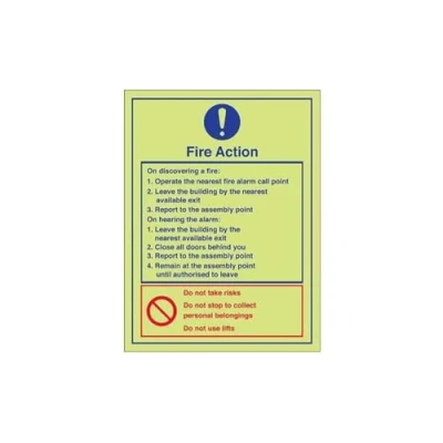 Provides essential information regarding action to be taken in the event of a fire Conforms to EN ISO 7010:2012 Portrait Orientation. Sign reads "Fire Action. On Discovering A Fire: Operate The Nearest Fire Alarm Call Point. Leave The Building By The Nearest Available Exit. Report To The Assembly Point" Highly durable Glow In The Dark Self Adhesive Vinyl and screen printed message will stand the test of time Sign measures 200 x 300mm. Self Adhesive material will adhere securely to most surfaces