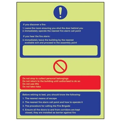 Provides essential information regarding action to be taken in the event of a fire Conforms to EN ISO 7010:2012 Portrait Orientation. Sign reads "If You Discover A Fire. Leave The Room Ensuring You Shut The Door Behind You. Immediately Operate The Nearest Fire Alarm Call Point" Highly durable Glow In The Dark Self Adhesive Vinyl and screen printed message will stand the test of time Sign measures 200 x 300mm. Self Adhesive material will adhere securely to most surfaces