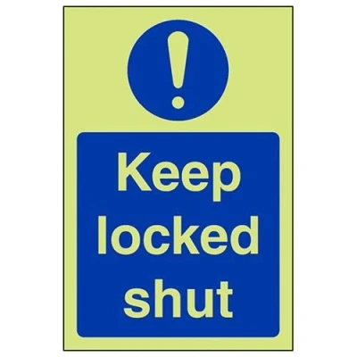 Helps to fulfil obligations to show vital escape route information about fire doors for all employees and visitors as per Health and Safety (Safety Signs & Signals) Regulations 1996 Conforms to EN ISO 7010:2012 Portrait Orientation. Sign reads "Keep Locked Shut" Highly durable Glow In The Dark 1mm plastic material and screen printed message will stand the test of time Sign measures 150 x 200mm