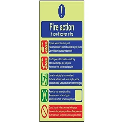 Provides essential information regarding action to be taken in the event of a fire Conforms to EN ISO 7010:2012 Portrait Orientation. Sign reads "Fire Action. If You Discover A Fire. Operate Nearest Fire Alarm Point. Fire Brigade Will Be Called Automatically" Highly durable Glow In The Dark 1mm plastic material and screen printed message will stand the test of time Sign measures 200 x 300mm