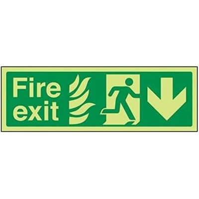 V Safety Glow In The Dark NHS Fire Exit Arrow Down Sign 600mm x 200mm Self Adhesive Vinyl