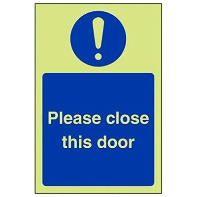 Helps to fulfil obligations to show vital escape route information about fire doors for all employees and visitors as per Health and Safety (Safety Signs & Signals) Regulations 1996 Conforms to EN ISO 7010:2012 Portrait Orientation. Sign reads "Please Close This Door" Highly durable Glow In The Dark Self Adhesive Vinyl and screen printed message will stand the test of time Sign measures 100 x 150mm. Self Adhesive material will adhere securely to most surfaces