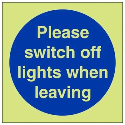 Helps to fulfil obligations to show vital escape route information about fire doors for all employees and visitors as per Health and Safety (Safety Signs & Signals) Regulations 1996 Conforms to EN ISO 7010:2012 Square Orientation. Sign reads "Please Switch Off Lights When Leaving" Highly durable Glow In The Dark Self Adhesive Vinyl and screen printed message will stand the test of time Sign measures 200 x 200mm. Self Adhesive material will adhere securely to most surfaces