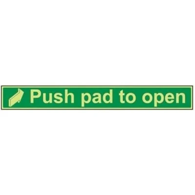 Helps to fulfil legal obligations to inform of the direction in which safety can be reached as per Health and Safety (Safety Signs & Signals) Regulations 1996 Conforms to EN ISO 7010:2012 by featuring a green background with a white pictogram or text positioned centrally Landscape Orientation. Sign reads "Push Pad To Open" Highly durable Glow In The Dark Self Adhesive Vinyl and screen printed message will stand the test of time Sign measures 600 x 75mm. Self Adhesive material will adhere securely to most surfaces
