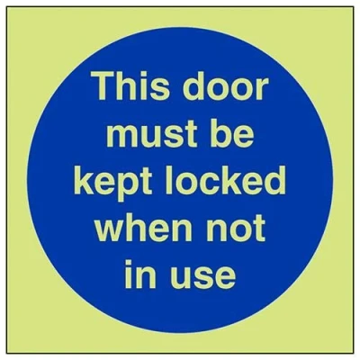 Helps to fulfil obligations to show vital escape route information about fire doors for all employees and visitors as per Health and Safety (Safety Signs & Signals) Regulations 1996 Conforms to EN ISO 7010:2012 Square Orientation. Sign reads "This Door Must Be Kept Locked When Not In Use" Highly durable Glow In The Dark Self Adhesive Vinyl and screen printed message will stand the test of time Sign measures 100 x 100mm. Self Adhesive material will adhere securely to most surfaces