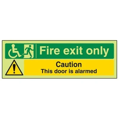 Helps to fulfil obligations to identify escape routes in a fire emergency for all members of staff and visitors as per Health and Safety (Safety Signs & Signals) Regulations 1996 Conforms to EN ISO 7010:2012 by featuring a green background with a white pictogram or text positioned centrally Landscape Orientation. Sign reads "Fire Exit Only. Caution This Door Is Alarmed" Highly durable Glow In The Dark Self Adhesive Vinyl and screen printed message will stand the test of time Sign measures 300 x 100mm. Self Adhesive material will adhere securely to most surfaces