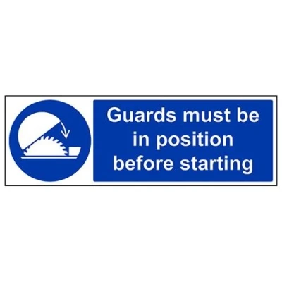 Helps to fulfil legal obligations to advise employees and visitors of specific actions and behaviour which must be adhered to in order to ensure personal safety as per Health and Safety (Safety Signs & Signals) Regulations 1996 Conforms to EN ISO 7010:2012 - Mandatory Signs feature a round symbol with a blue background of at least 50% of the total sign area, with a white pictogram and text Landscape Orientation. Sign reads "Guards Must Be In Position Before Starting" Highly durable 1mm plastic material and screen printed message will stand the test of time Sign measures 600 x 200mm