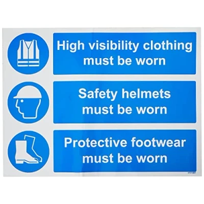 Helps to fulfil legal obligations to remind staff and visitors to wear the appropriate PPE when required to ensure personal safety as per Health and Safety (Safety Signs & Signals) Regulations 1996 Conforms to EN ISO 7010:2012 - Mandatory Signs feature a round symbol with a blue background of at least 50% of the total sign area with a white pictogram and text Landscape Orientation. Sign reads "High Visibility Clothing Must Be Worn. Safety Helmets Must Be Worn. Protective Footwear Must Be Worn" Highly durable Self Adhesive Vinyl material and screen printed message will stand the test of time Sign measures 400 x 300mm. Self Adhesive material will adhere securely to most surfaces
