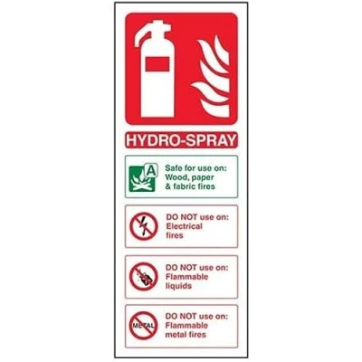 Helps fulfil obligations to convey essential information relating to fire fighting equipment as per Health and Safety (Safety Signs & Signals) Regulations 1996 Conforms to EN ISO 7010:2012 Portrait Orientation. Sign reads "Hydro-Spray. Safe For Use On Wood, Paper & Fabric Fires. DO NOT Use On Electrical Fires. DO NOT Use On Flammable Liquids. DO NOT Use On Flammable Metal Fires" Highly durable 1mm plastic material and screen printed message will stand the test of time Sign measures 75 x 200mm