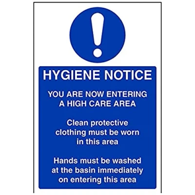 Helps to fulfil legal obligations to remind staff and visitors to wear the appropriate PPE in catering environments to ensure personal safety and maintain hygiene levels Conforms to EN ISO 7010:2012 - Mandatory Signs feature a round symbol with a blue background of at least 50% of the total sign area, with a white pictogram and text Portrait Orientation. Sign reads "Hygiene Notice. You Are Now Entering A High Care Area. Clean Protective Clothing Must Be Worn In This Area. Hands Must be Washed At The Basin Immediately" Highly durable Self Adhesive Vinyl material and screen printed message will stand the test of time Sign measures 200 x 300mm. Self Adhesive material will adhere securely to most surfaces
