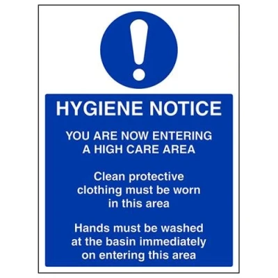 Helps to fulfil legal obligations to remind staff and visitors to wear the appropriate PPE in catering environments to ensure personal safety and maintain hygiene levels Conforms to EN ISO 7010:2012 - Mandatory Signs feature a round symbol with a blue background of at least 50% of the total sign area, with a white pictogram and text Portrait Orientation. Sign reads "Hygiene Notice. You Are Now Entering A High Care Area. Clean Protective Clothing Must Be Worn In This Area. Hands Must be Washed At The Basin Immediately" Highly durable Self Adhesive Vinyl material and screen printed message will stand the test of time Sign measures 300 x 400mm. Self Adhesive material will adhere securely to most surfaces