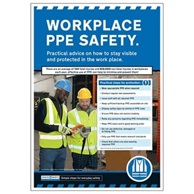 According to the HSE, 609,000 injuries and 144 fatalities occur in UK workplaces every year, protect employees and visitors by helping to avoid accidents Lightweight design allows poster to be easily attached to walls and repositioned whenever necessary Ideal for displaying in workplaces such as first aid rooms, workshops, offices and warehouses Printed directly on to polypropylene, producing high image quality PPE is essential for employees who are working in a high-risk environment