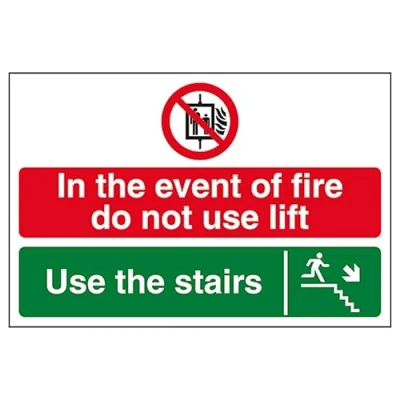 V Safety In The Event Of Fire Do Not Use Lift/Use Stairs Down Right 300 x 200 mm Self Adhesive Vinyl Sign
