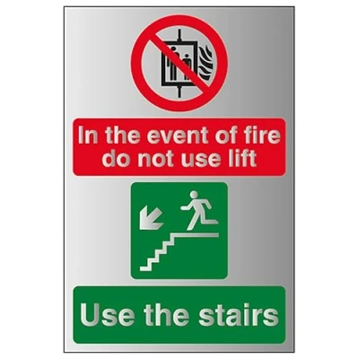 V Safety In The Event Of Fire Do Not Use Lift/Use Stairs Left 200 x 300 mm Self Adhesive Vinyl Aluminium Effect Sign