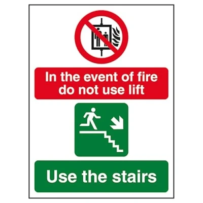 V Safety In The Event Of Fire Do Not Use Lift/Use Stairs Right 200 x 300 mm Self Adhesive Vinyl Sign