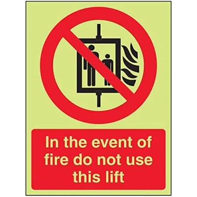 V Safety In the event of fire do not use this lift 400x600mm Self Adhesive Vinyl Sign