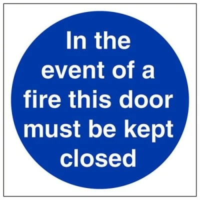 Helps to fulfil obligations to show vital escape route information about fire doors for all employees and visitors as per Health and Safety (Safety Signs & Signals) Regulations 1996 Conforms to EN ISO 7010:2012 Square Orientation. Sign reads "In The Event Of Fire This Door Must Be Closed" Highly durable Self Adhesive Vinyl material and screen printed message will stand the test of time Sign measures 200 x 200mm. Self Adhesive material will adhere securely to most surfaces