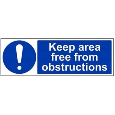 Helps to fulfil legal obligations to advise employees and visitors of specific actions and behaviour which must be adhered to in order to ensure personal safety as per Health and Safety (Safety Signs & Signals) Regulations 1996 Conforms to EN ISO 7010:2012 - Mandatory Signs feature a round symbol with a blue background of at least 50% of the total sign area, with a white pictogram and text Landscape Orientation. Sign reads "Keep Area Free From Obstructions" Highly durable Self Adhesive Vinyl material and screen printed message will stand the test of time Sign measures 450 x 150mm. Self Adhesive material will adhere securely to most surfaces