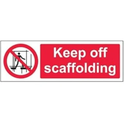 Clearly displays prohibited and potentially dangerous actions which employees and visitors must avoid in the interests of health and safety as per Health and Safety (Safety Signs & Signals) Regulations 1996 Conforms to EN ISO 7010:2012 - Prohibition signs feature a red circular symbol of at least 35% of the total sign area, on a white background, with a black pictogram Landscape Orientation. Sign reads "Keep Off Scaffolding" Highly durable Self Adhesive Vinyl material and screen printed message will stand the test of time Sign measures 300 x 100mm. Self Adhesive material will adhere securely to most surfaces
