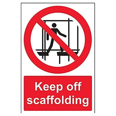 Clearly displays prohibited and potentially dangerous actions which employees and visitors must avoid in the interests of health and safety as per Health and Safety (Safety Signs & Signals) Regulations 1996 Conforms to EN ISO 7010:2012 - Prohibition signs feature a red circular symbol of at least 35% of the total sign area, on a white background, with a black pictogram Portrait Orientation. Sign reads "Keep Off Scaffolding" Highly durable Self Adhesive Vinyl material and screen printed message will stand the test of time Sign measures 200 x 300mm. Self Adhesive material will adhere securely to most surfaces