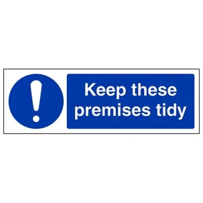 Helps to fulfil legal obligations to advise employees and visitors of specific actions and behaviour which must be adhered to in order to ensure personal safety as per Health and Safety (Safety Signs & Signals) Regulations 1996 Conforms to EN ISO 7010:2012 - Mandatory Signs feature a round symbol with a blue background of at least 50% of the total sign area, with a white pictogram and text Landscape Orientation. Sign reads "Keep These Premises Tidy" Highly durable 1mm plastic material and screen printed message will stand the test of time Sign measures 300 x 100mm