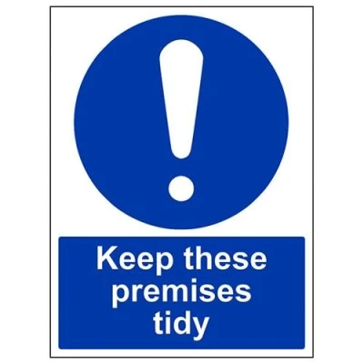 Helps to fulfil legal obligations to advise employees and visitors of specific actions and behaviour which must be adhered to in order to ensure personal safety as per Health and Safety (Safety Signs & Signals) Regulations 1996 Conforms to EN ISO 7010:2012 - Mandatory Signs feature a round symbol with a blue background of at least 50% of the total sign area, with a white pictogram and text Portrait Orientation. Sign reads "Keep These Premises Tidy" Highly durable 1mm plastic material and screen printed message will stand the test of time Sign measures 300 x 400mm