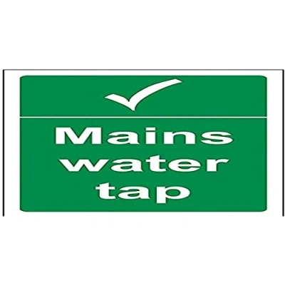 Helps to fulfil legal obligations to inform of the direction in which safety can be reached as per Health and Safety (Safety Signs & Signals) Regulations 1996 Conforms to EN ISO 7010:2012 by featuring a green background with a white pictogram or text positioned centrally Portrait Orientation. Sign reads "Mains Water Tap" Highly durable 1mm plastic material and screen printed message will stand the test of time Sign measures 100 x 150mm