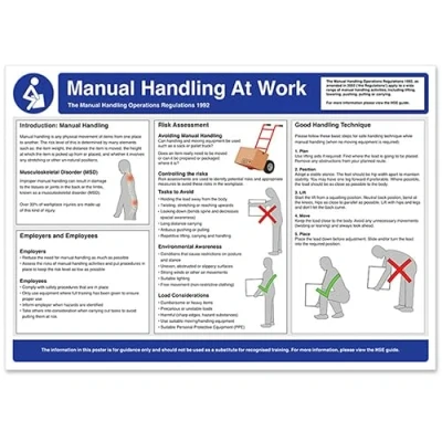 Ensure your employees and visitors are aware of the correct handling techniques to reduce accidents and injuries Clear step-by-step instructions portray how accidents can be prevented whilst maintaining a safe working environment According to the HSE, 609,000 injuries and 144 fatalities occur in UK workplaces every year, protect employees and visitors by helping to avoid accidents Ideal for displaying in workplaces such as workshops, offices and warehouses Reinforced Super-Tough Flexi-Plastic, ultra-durable, shatterproof, and stronger than acrylic for maximum impact resistance.