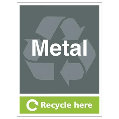 V Safety Metal Recycle Here Portrait 300 x 400 mm Self Adhesive Vinyl Aluminium Effect Sign