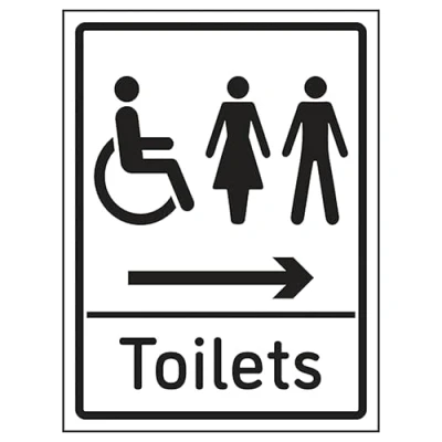 Ensure rooms, facilities and directions are all prominently displayed Provide directions to facilities on your premises Clear and easy to understand - black symbol and black text on a white background Conforms to EN ISO 7010:2020 2mm Super-Tough Rigid Plastic, impact-resistant, shatterproof, and designed to withstand vandalism and harsh environments.