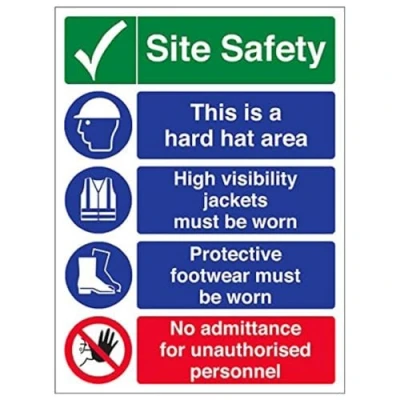 Helps to fulfil legal obligations to inform employees, visitors and the general public of potential hazards as per Health and Safety (Safety Signs & Signals) Regulations 1996 Conforms to EN ISO 7010:2012 - Warning signs feature a triangular symbol with a black pictogram and yellow background occupying at least 50% of the total sign area Portrait Orientation. Sign reads "Site Safety. This Is A Hard Hat Area. High Visibility Jackets Must Be Worn. No Admittance For Unauthorised Personnel" Highly durable and heavy duty 2mm rigid plastic material Sign measures 300 x 400mm
