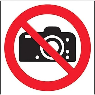 V Safety No Cameras Logo Prohibition Sign 200mm x Self Adhesive Vinyl