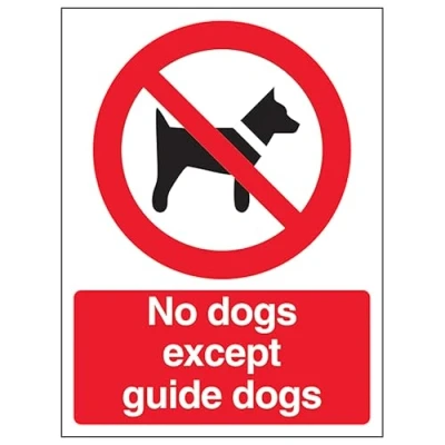 V Safety No Dogs Except Guide 150 x 200 mm Self Adhesive Vinyl Aluminium Effect Sign