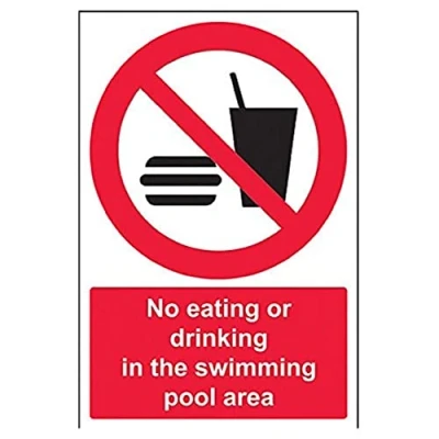 Clearly displays prohibited and potentially dangerous actions which employees and visitors must avoid in the interests of health and safety as per Health and Safety (Safety Signs & Signals) Regulations 1996 Conforms to EN ISO 7010:2012 - Prohibition signs feature a red circular symbol of at least 35% of the total sign area, on a white background, with a black pictogram Portrait Orientation. Sign reads "No Eating or Drinking In The Swimming Pool Area" Highly durable Self Adhesive Vinyl material and screen printed message will stand the test of time Sign measures 200 x 300mm. Self Adhesive material will adhere securely to most surfaces