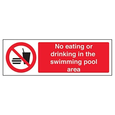 Clearly displays prohibited and potentially dangerous actions which employees and visitors must avoid in the interests of health and safety as per Health and Safety (Safety Signs & Signals) Regulations 1996 Conforms to EN ISO 7010:2012 - Prohibition signs feature a red circular symbol of at least 35% of the total sign area, on a white background, with a black pictogram Landscape Orientation. Sign reads "No Eating Or Drinking In The Swimming Pool Area" Highly durable Self Adhesive Vinyl material and screen printed message will stand the test of time Sign measures 300 x 100mm. Self Adhesive material will adhere securely to most surfaces