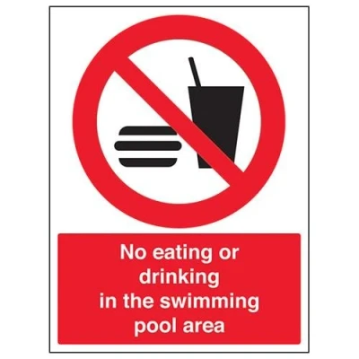 Clearly displays prohibited and potentially dangerous actions which employees and visitors must avoid in the interests of health and safety as per Health and Safety (Safety Signs & Signals) Regulations 1996 Conforms to EN ISO 7010:2012 - Prohibition signs feature a red circular symbol of at least 35% of the total sign area, on a white background, with a black pictogram Portrait Orientation. Sign reads "No Eating or Drinking In The Swimming Pool Area" Highly durable Self Adhesive Vinyl material and screen printed message will stand the test of time Sign measures 300 x 400mm. Self Adhesive material will adhere securely to most surfaces