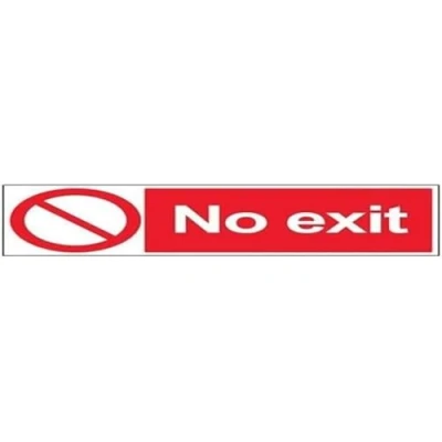 Clearly displays prohibited and potentially dangerous actions which employees and visitors must avoid in the interests of health and safety as per Health and Safety (Safety Signs & Signals) Regulations 1996 Conforms to EN ISO 7010:2012 - Prohibition signs feature a red circular symbol of at least 35% of the total sign area, on a white background, with a black pictogram Landscape Orientation. Sign reads "No Exit" Highly durable Self Adhesive Vinyl material and screen printed message will stand the test of time Sign measures 600 x 200mm. Self Adhesive material will adhere securely to most surfaces