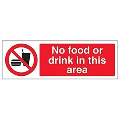Clearly displays prohibited and potentially dangerous actions which employees and visitors must avoid in the interests of health and safety as per Health and Safety (Safety Signs & Signals) Regulations 1996 Conforms to EN ISO 7010:2012 - Prohibition signs feature a red circular symbol of at least 35% of the total sign area, on a white background, with a black pictogram Landscape Orientation. Sign reads "No Food or Drink In This Area" Highly durable Self Adhesive Vinyl material and screen printed message will stand the test of time Sign measures 300 x 100mm. Self Adhesive material will adhere securely to most surfaces