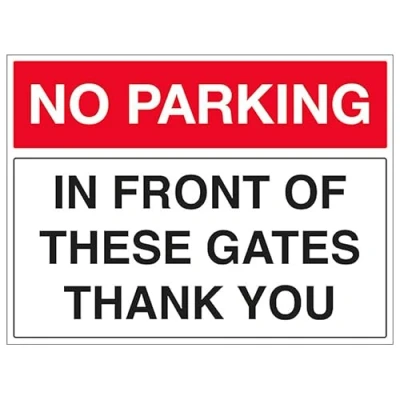 V Safety No Parking In Front Of These Gates Thank You Landscape 600 x 450 mm 3mm Reflective Aluminium Composite Sign