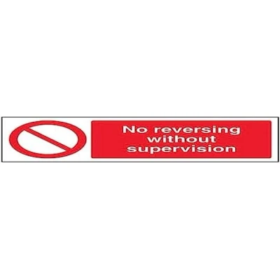 Clearly displays prohibited and potentially dangerous actions which employees and visitors must avoid in the interests of health and safety as per Health and Safety (Safety Signs & Signals) Regulations 1996 Conforms to EN ISO 7010:2012 - Prohibition signs feature a red circular symbol of at least 35% of the total sign area, on a white background, with a black pictogram Landscape Orientation. Sign reads "No Reversing Without Supervision" Highly durable Self Adhesive Vinyl material and screen printed message will stand the test of time Sign measures 300 x 100mm. Self Adhesive material will adhere securely to most surfaces