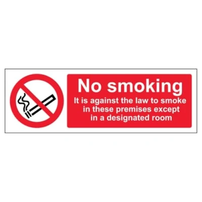 V Safety No Smoking Except In Designated Room Landscape 300 x 100 mm Glow The Dark 1mm Rigid Plastic Sign