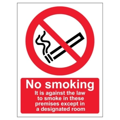 V Safety No Smoking Except In Designated Room Portrait 150 x 200mm 2mm Rigid Plastic Sign